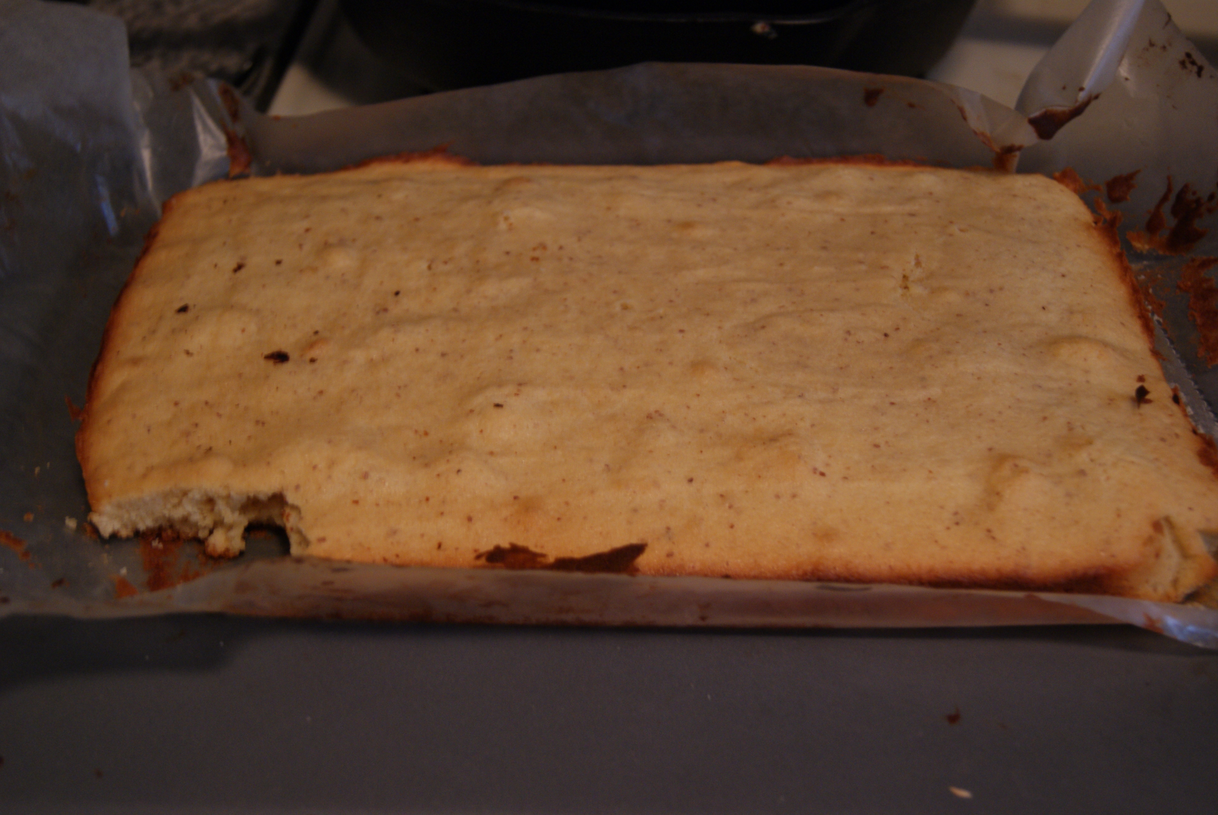 When your egg yolk/almond mixture is fluffy, stir in your flour to form a dough. Now, move on to the egg whites. Using a hand mixer or stand mixer at medium speed, beat the egg whites until soft peaks begin to form. This should take about five minutes. It took me ten, but only because I don’t know how to properly attach the beaters and they flew off mid-mix. I spent two minutes saying words not meant to be uttered on Easter Sunday, and spent another three scrubbing those suckers clean. When puffy and peak-filled, fold the egg white mixture into your dough, and spread the mixture into your pan. Bake for about 25 minutes, until a toothpick inserted into the center comes out clean.