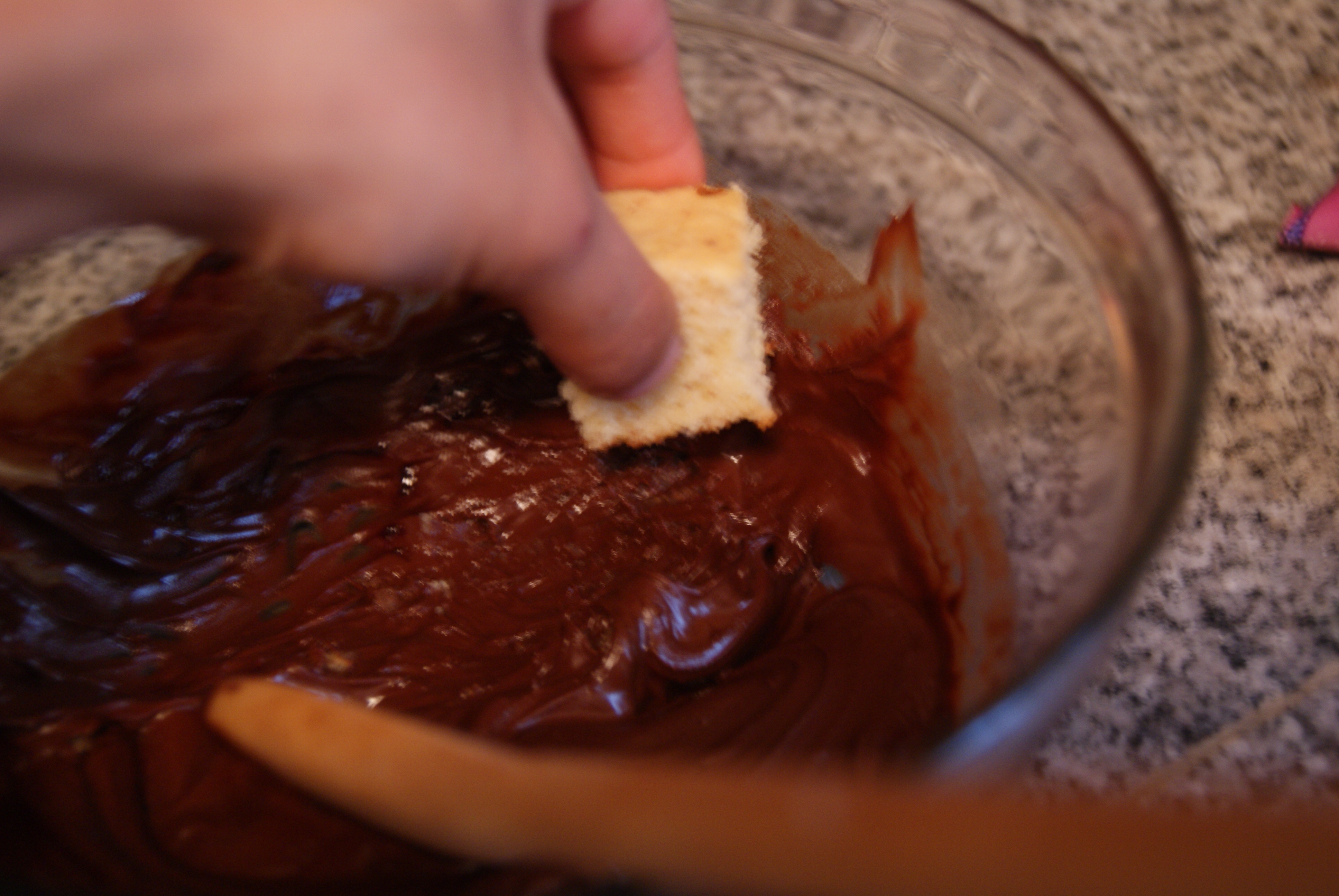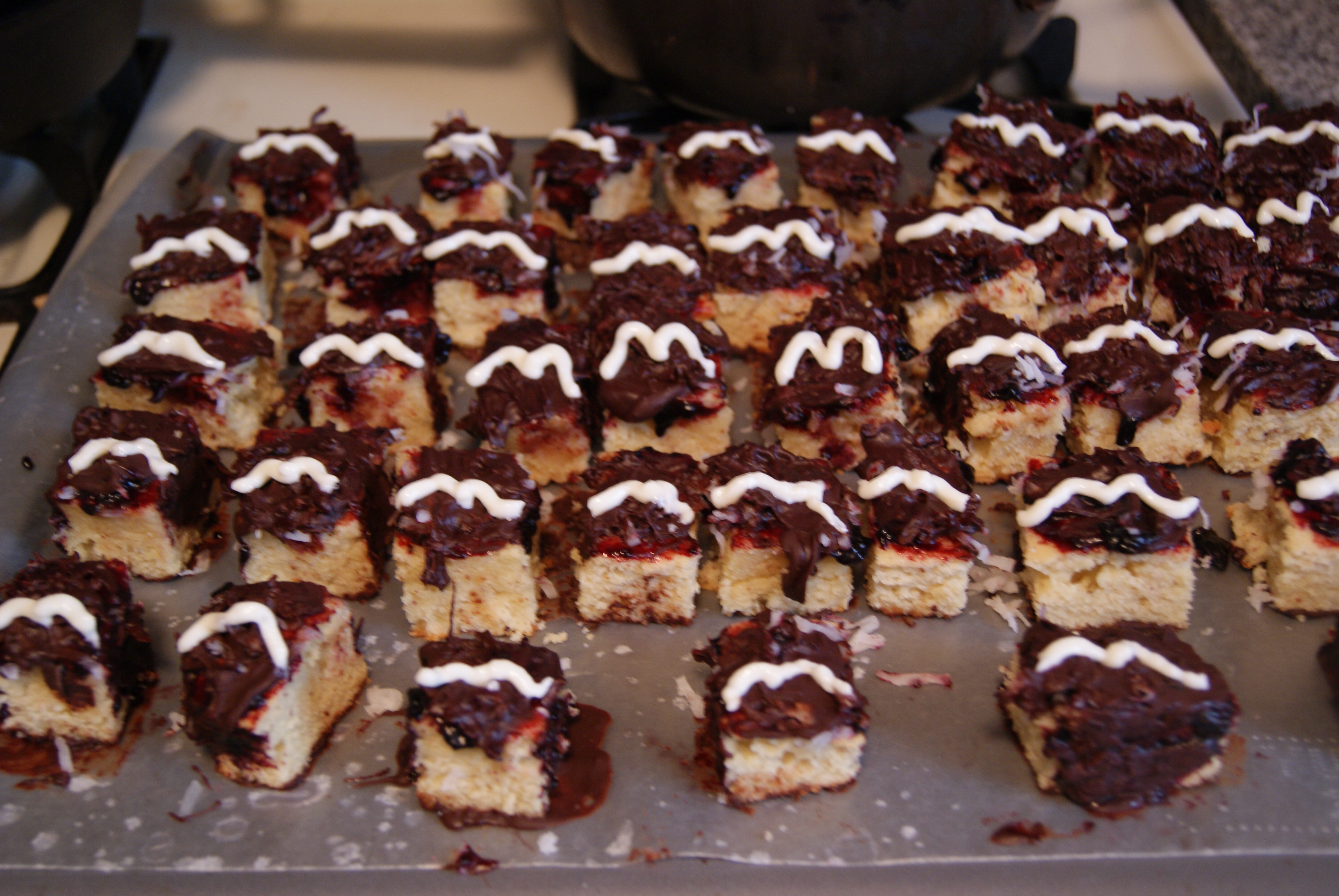 Here’s where things get…complicated. I am positive that there is a neater way to accomplish this, but, well, I yam who I yam. I dunked one side of each cookie into my melted chocolate and placed it on a cookie sheet to cool. Then, I spread jam on the tops and sprinkled coconut over the sheet until each cookie was covered. Lastly, using a butter knife, I spread the rest of the melted chocolate over the top of each cookie, then placed them in the refrigerator to allow the chocolate to harden. Mess? Yes. Mess. Also, delicious.
