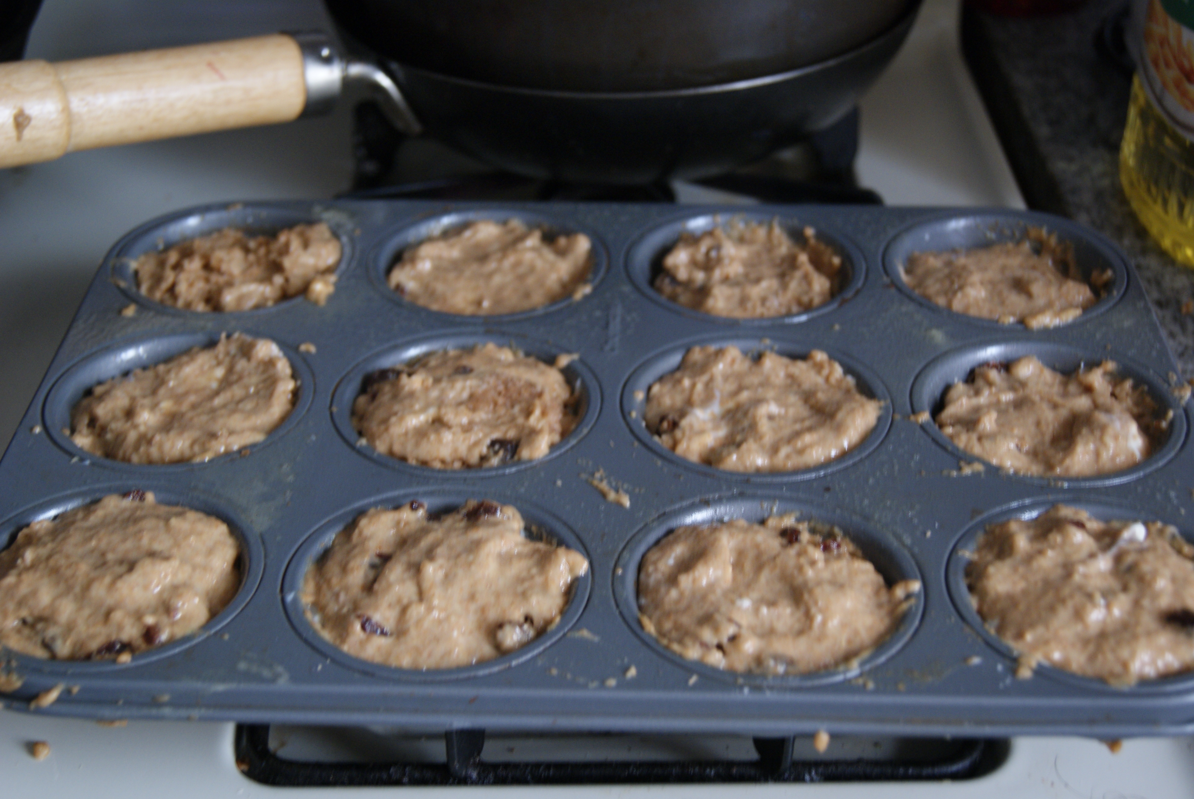 I’d made a variation on these last year, and remembered that Mom really dug them. They’re honey and goat cheese-filled fig muffins. These have a pretty decent amount of fiber in them, and are lower in sugar than many other muffins, so they’d be perfect for a breakfast treat now and then. I switched everything up a bit this time around. Here’s what you’ll need for my version: