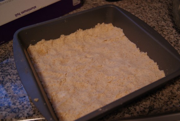 Preheat the oven to 350°F. In a large bowl, combine the butter, flour and sugar for the crust. You can use a fork or your hands if you’re into feeling things, man. Work into a crumbly mixture, then press this evenly into an 8×8 square pan. Toss into the oven for 20 minutes. You’ll probably be annoyed at this point because when you take it out the crust will [should] still be white and look totally underbaked. You’ll think Irene took your oven when she took your pride and sanity from you. But fear not, it’s supposed to look like that.