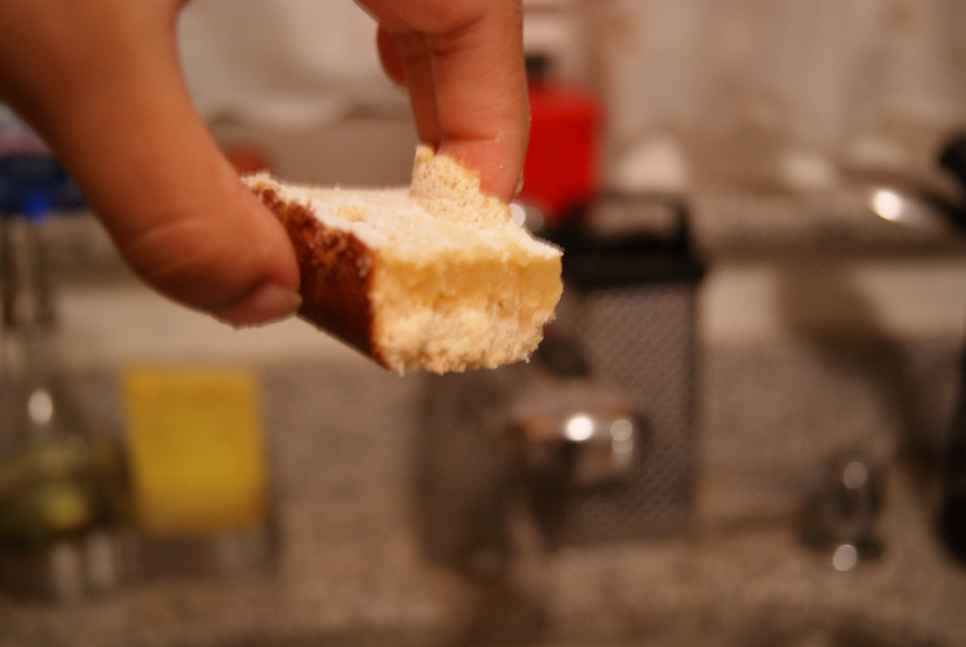 While the crust bakes, prep the filling. Toss your two eggs, sugar, flour, baking powder and lemon juice into a blender and puree until smooth. Super easy, right? When the crust comes out, pour this over it, maybe give the pan a gentle shake to evenly distribute, and send back into the oven for another 20 minutes. When they’re done, you can sprinkle a little powdered sugar over the top if you’re feeling fancy. Let them cool, then cut into squares (I came out with 16).