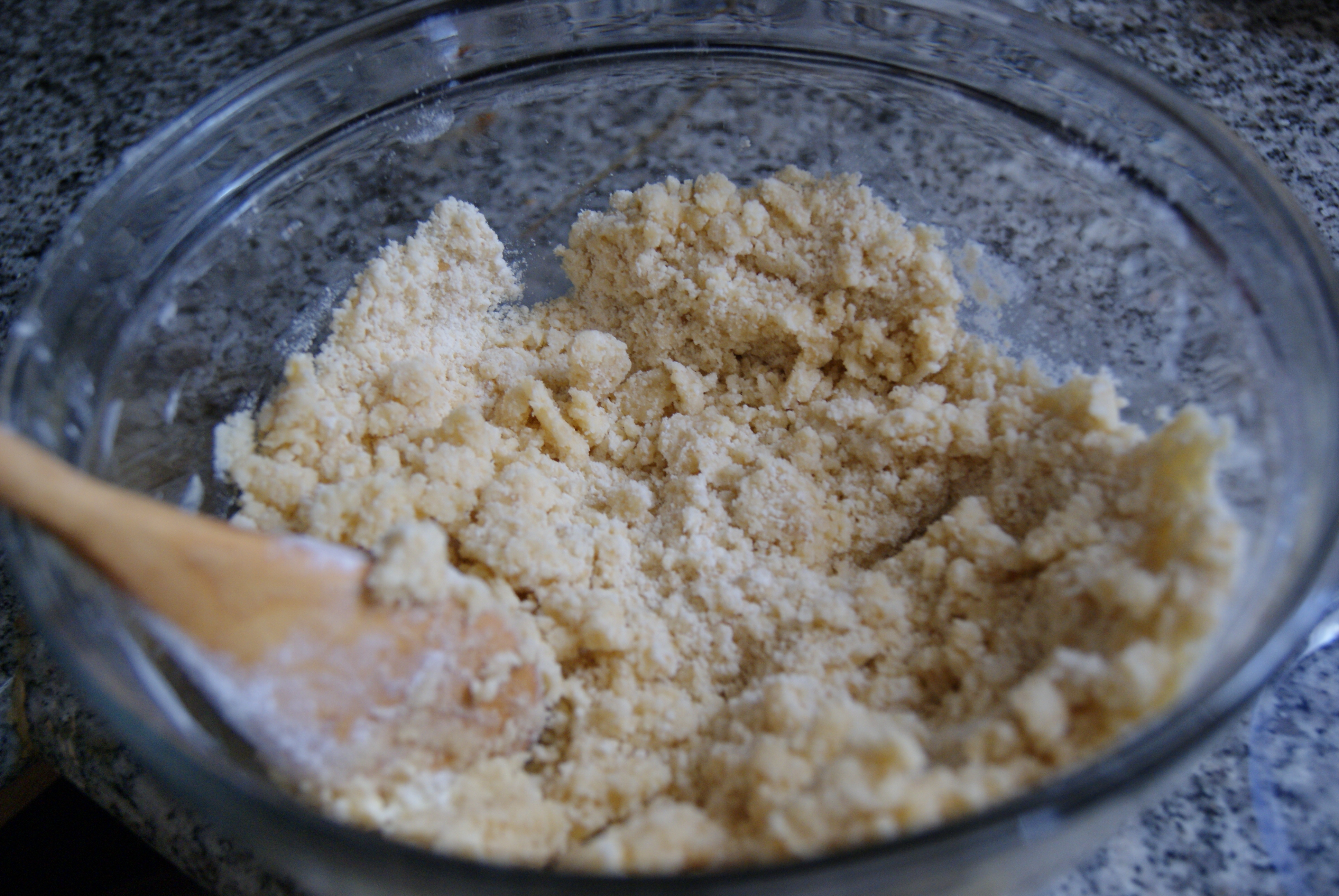 Preheat the oven to 350ΒΊF and grease a 9 x 13″ pan. Beat softened butter, flour, sugar and salt until you’ve got a crumbly/fluffy mixture that looks like this: