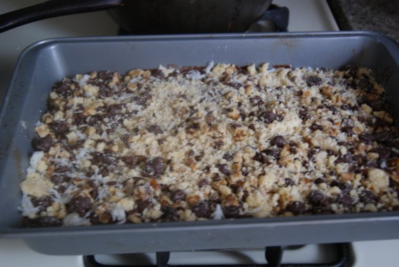 Meanwhile, stir the nuts, remaining 2/3 cup of chocolate chips, coconut, and other random goodies you might decide to add in (M&Ms perhaps?). Spread this over the chocolate mixture, and bake for 25 to 30 minutes, until the top looks slightly browned and the center is set.