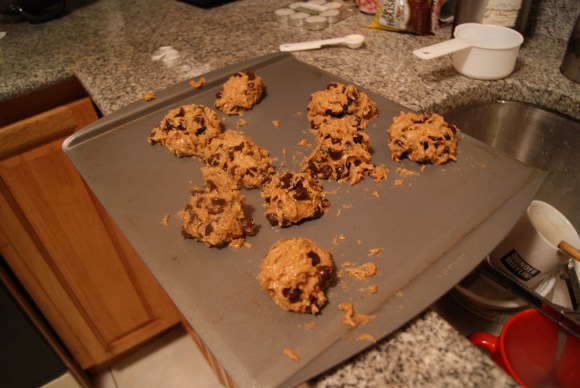 So, if you’re not into getting at least a little bit messy, this isn’t the recipe for you. Then again, if you’re not into getting a little bit messy, you picked the wrong site to bum around on, because I am all about the hot mess cookie process. Ohhh…the hot mess cookie. Future post, perhaps? Anyway, with clean hands, grab a handful of cookie dough and start covering an Oreo with it. Try to get the entire Oreo hidden so that it appears you’ve got plain ol’ jumbo cookies on your baking sheet.