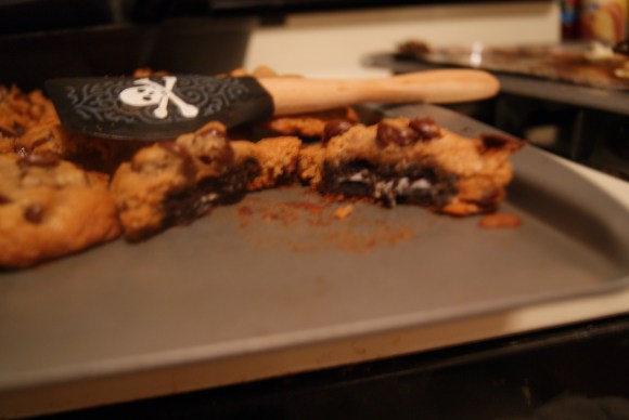 A few months before I started this blog, my friend Anthony posted a link on Facebook that caught my eye. It caught my eye because it was basically a link to a world of greatness, of wonder, of amazing ideas. About an hour after viewing the recipe for Oreo-stuffed chocolate chip cookies, I was whipping butter with sugar and laughing maniacally at what would become the treat that would cause my boss to proclaim, with a massive grin, “that thing was lethal. In a good way. But lethal.” Let’s do this thing.