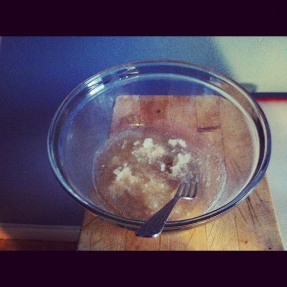 Now, if you don’t possess a candy thermometer, this next step will be slightly tricky for you. Basically, you’re trying to get the above concoction to reach “soft-ball stage.” What this means is when a drop of the mixture is placed into a bowl of cold water, the mixture will immediately form itself into a soft ball. Since I refused to buy myself a thermometer because I am cheap and lazy, I used this method. It took about 5 minutes after the mix reached the boiling point to get to this stage.