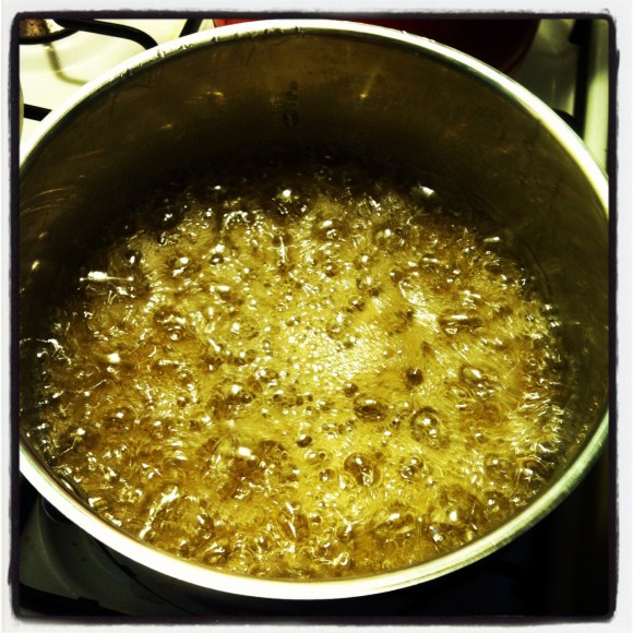 Combine the rest of your water, and the sugar, salt and corn syrup in a medium-sized saucepan. Cook this mixture over low heat, stirring constantly, until the sugar has completely dissolved. Raise to medium heat and let the mixture come to a boil without stirring it. If you have a candy thermometer, you can insert it now. If you start to see some of the mixture sticking to the sides, you can brush down with a pastry brush that has been dipped in cold water. But DON’T stir. When the mixture registers at 240ºF, remove from heat and let it sit for one minute.
