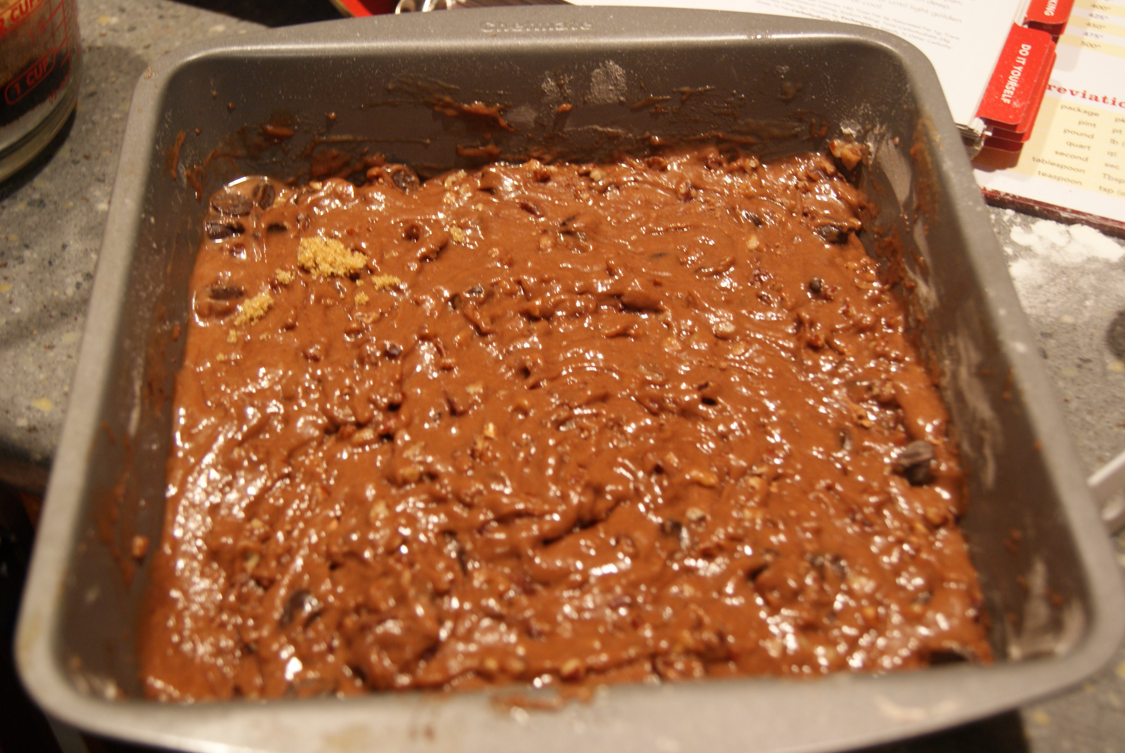 So, preheat your oven to 350°F. Now, in a 9×9″ un-greased square pan, mix your flour, granulated sugar, 2 tablespoons of cocoa, baking powder and salt together. Stir in milk, oil and vanilla until the batter is smooth, then fold in nuts and chocolate chips. Sprinkle the 1/4 cup of cocoa powder and cup of brown sugar evenly over the top, and then pour hot water over the mixture.