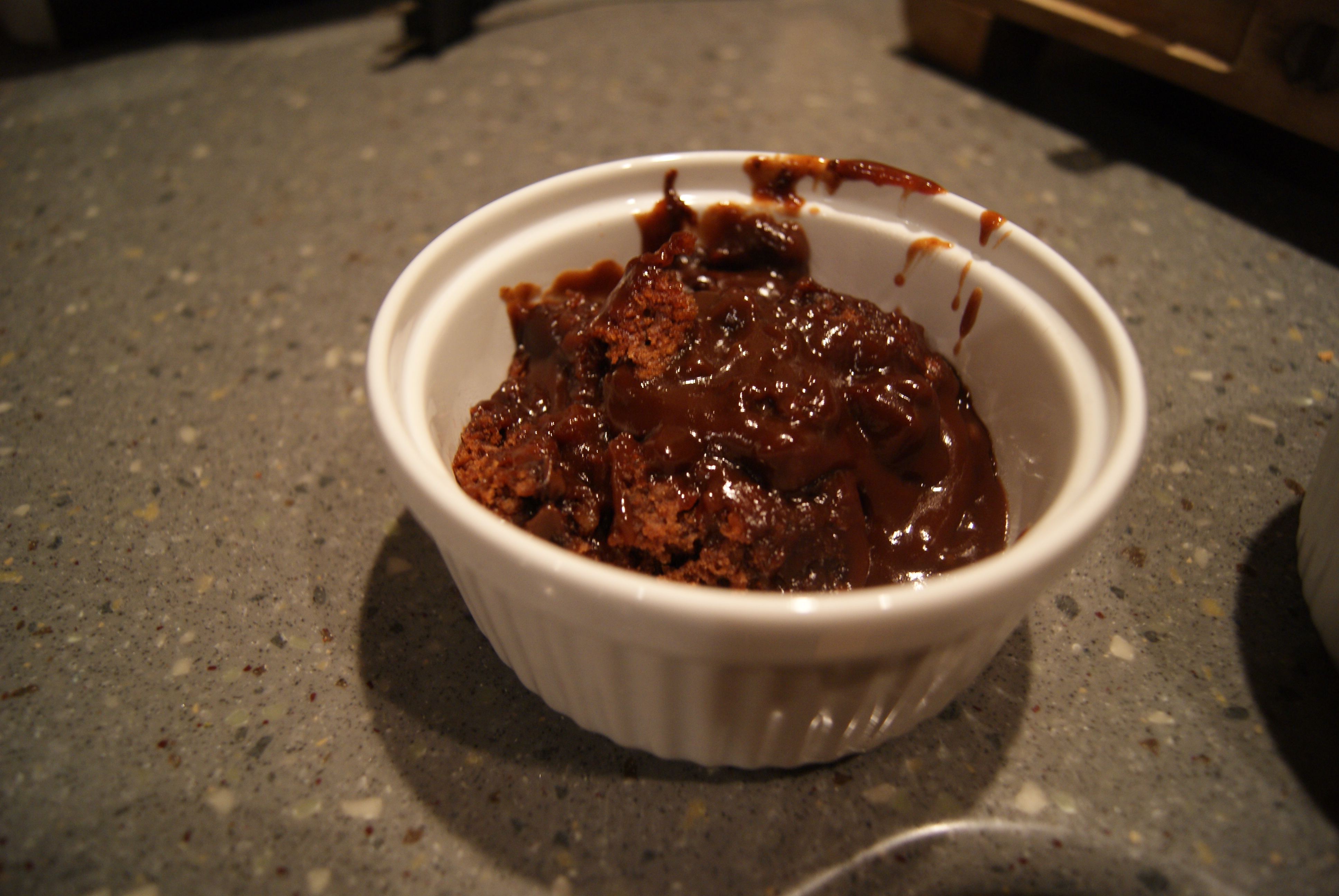 Send the pan into the oven for 40 minutes, or until the top is dry. Let cake cool for about 5 minutes, then scoop into dishes and top with ice cream if you’ve got any (I didn’t have any! The hits just keep on coming!).