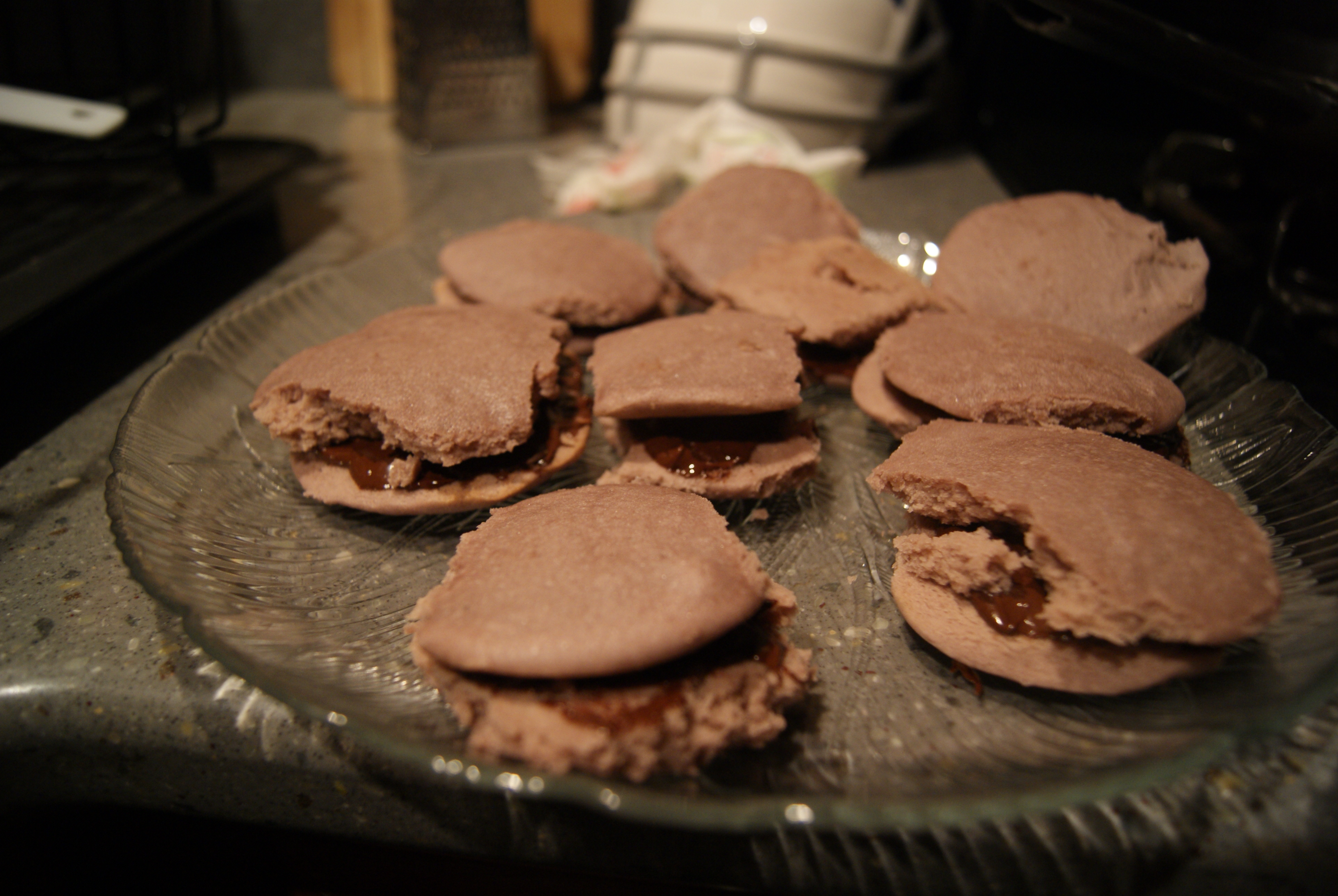 Now, melt your chocolate chips, either in a microwave or in a saucepan over a bowl of simmering water (make sure the water doesn’t touch the saucepan at all, as this will cause the chocolate to curdle).  Spread chocolate on the bottom of one cookie, then sandwich together with a kind of similar looking cookie.