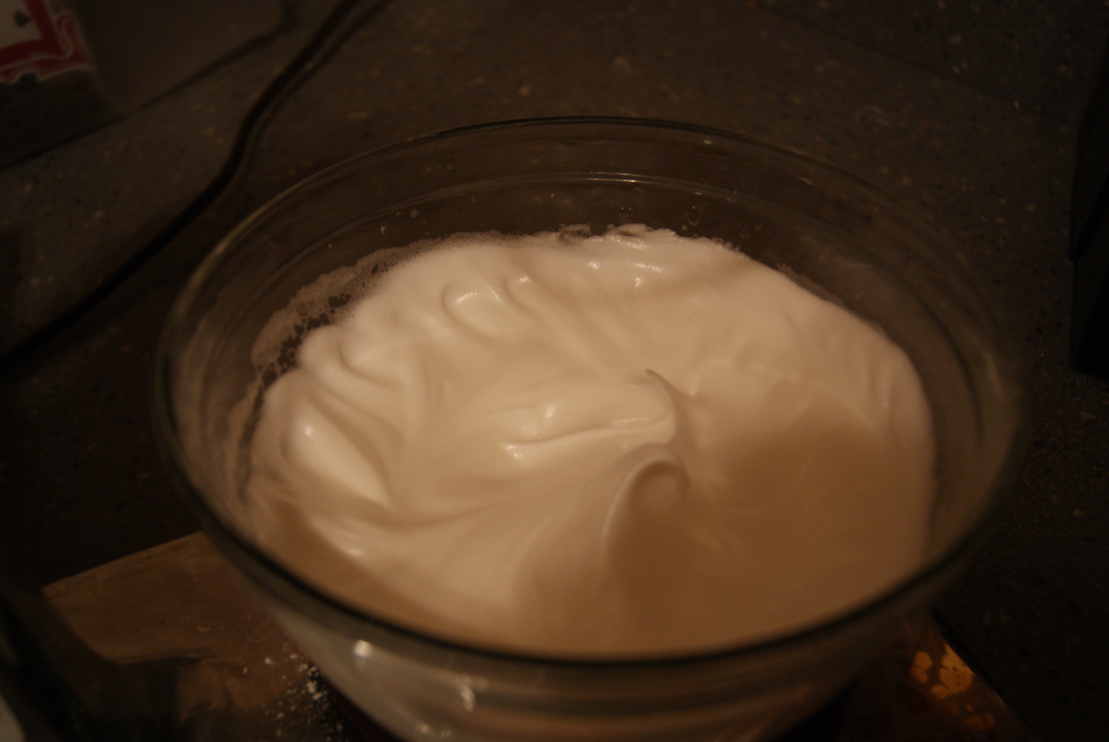 In a separate bowl, beat egg whites using a hand or stand mixer until foamy. Gradually add in 1/4 cup of the sugar and keep beating until stiff peaks form. The peaks should basically be so stiff that you can turn the bowl upside down without worrying about any of the whites spilling out. This takes time. Please don’t do what did and try to show off by flipping the bowl over too soon. Confidence is always key, over-confidence is foolish and humiliating.