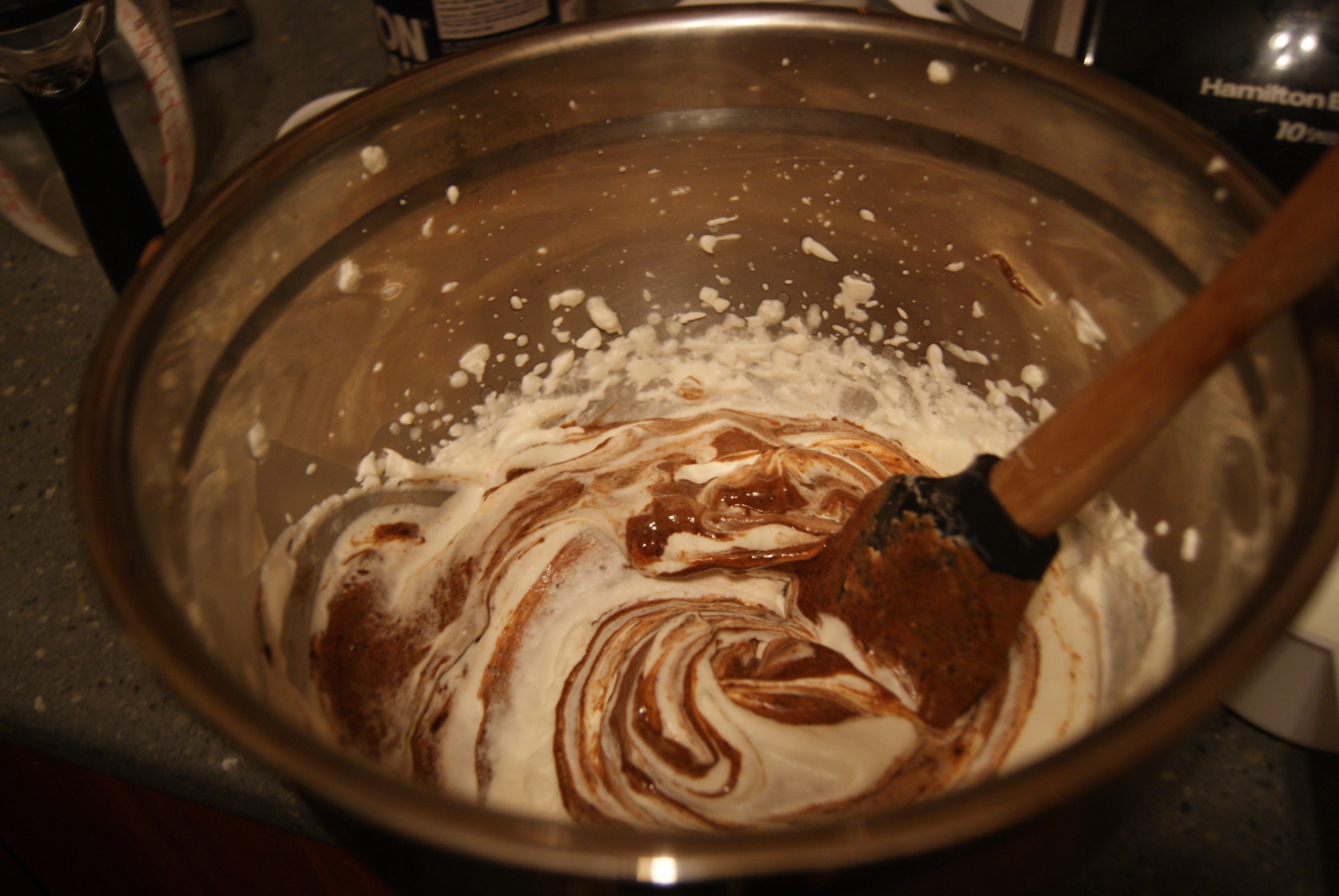 Gently fold the egg white mixture into the chocolate mixture, then carefully fold this into the whipped cream. Don’t overwork the mixture, as it will start to become heavy and soupy.