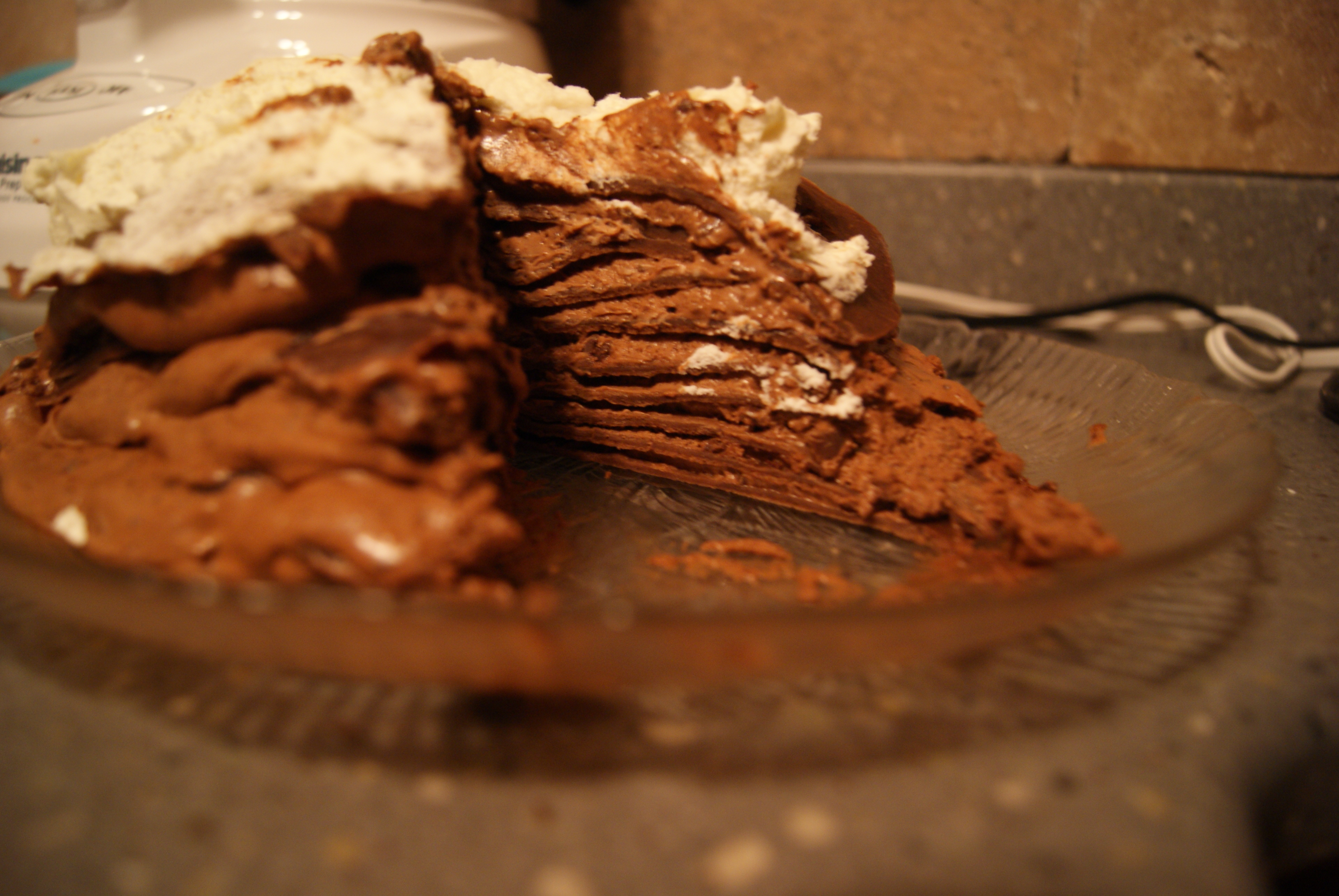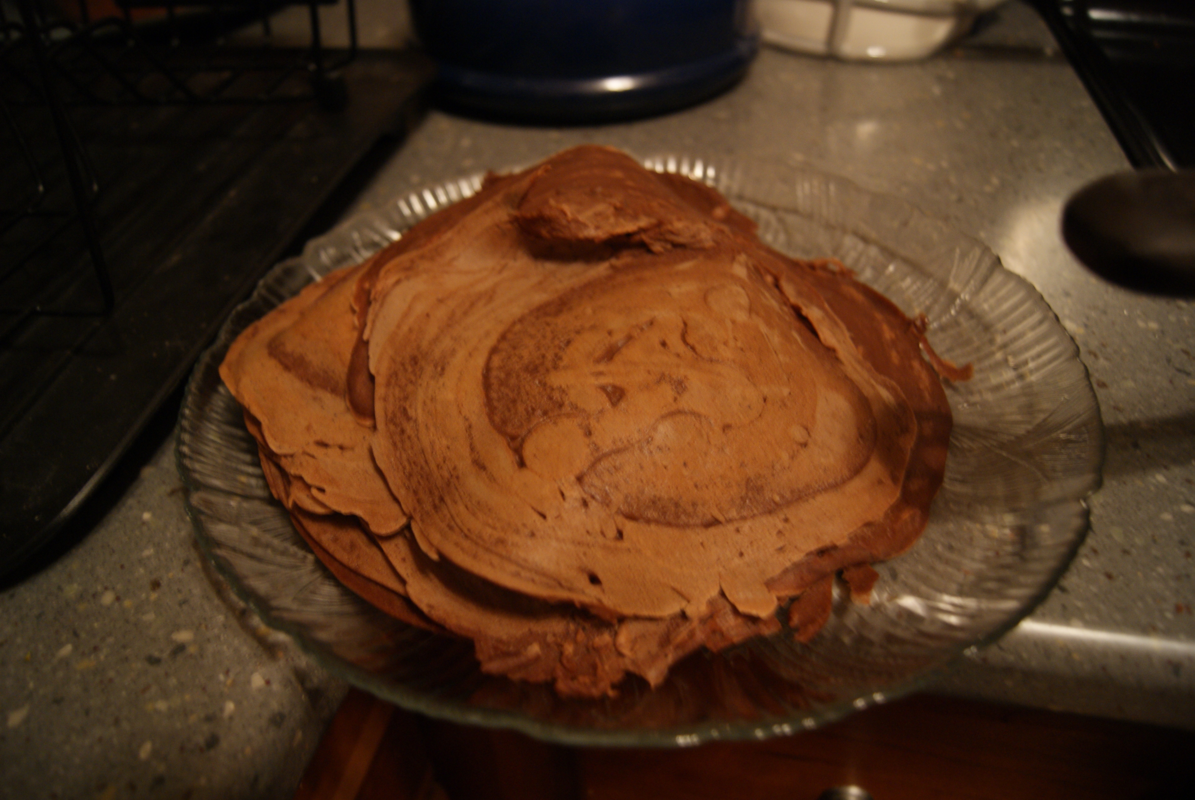 Chocolate Mousse Crepe Cake (makes one crazy-looking, 10-layer monstrosity)