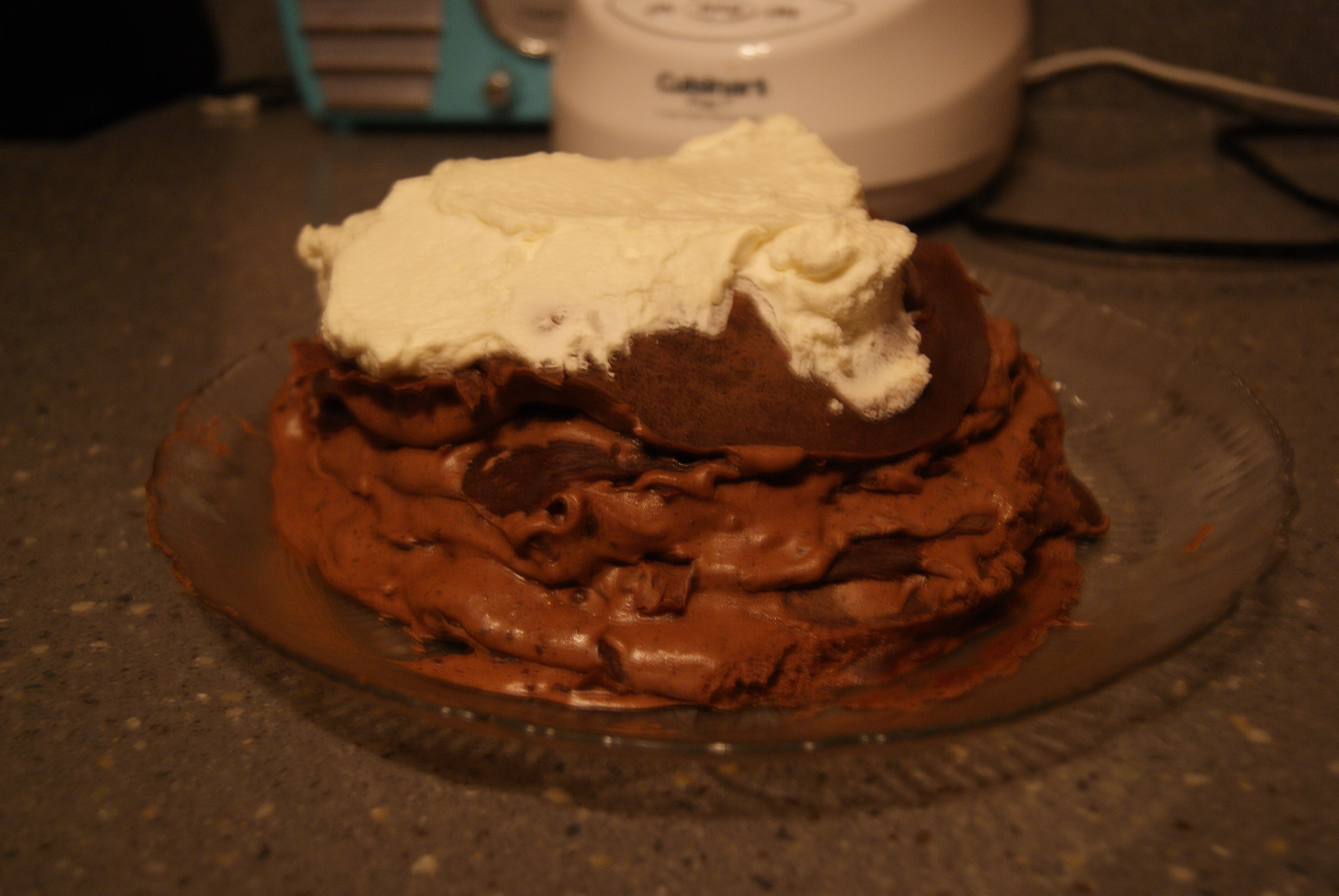 We’re pretty much almost done here, I swear. Once your crepes have cooled, it’s time to assemble this cake. Lay a crepe down on a cake plate, then spread a healthy amount of mousse over it. Top with another crepe, then top this crepe with more mousse, etc., until you reach the top of the holy mountain of good-God-nessness. You can top this with homemade whipped cream (which I highly recommend) if desired.