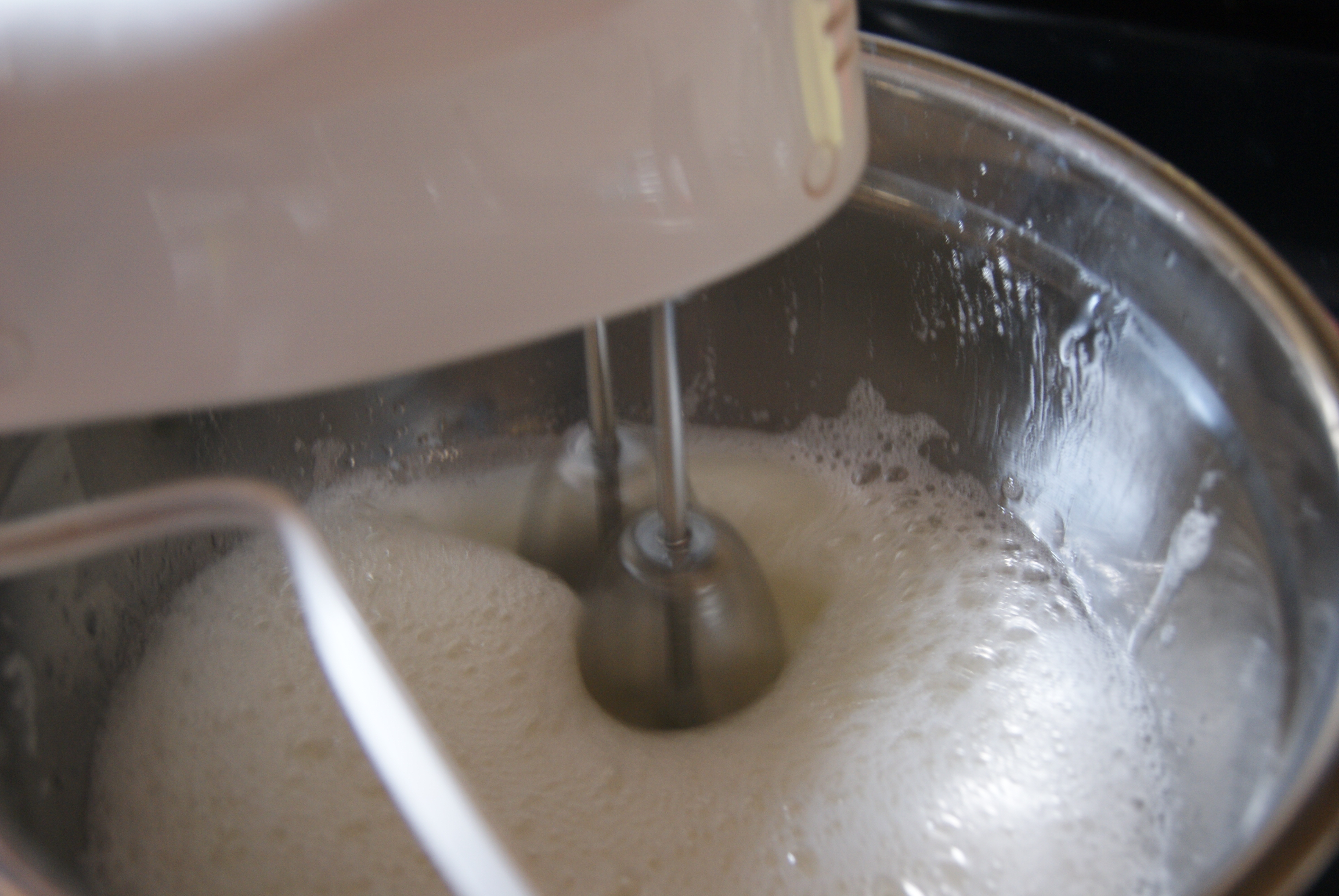 Now, place a large (and I do mean large, since the frosting will double in size once you start mixing) metal or glass bowl atop a large saucepan filled with barely simmering water. Place all ingredients in bowl, and beat on high speed using a hand mixer.