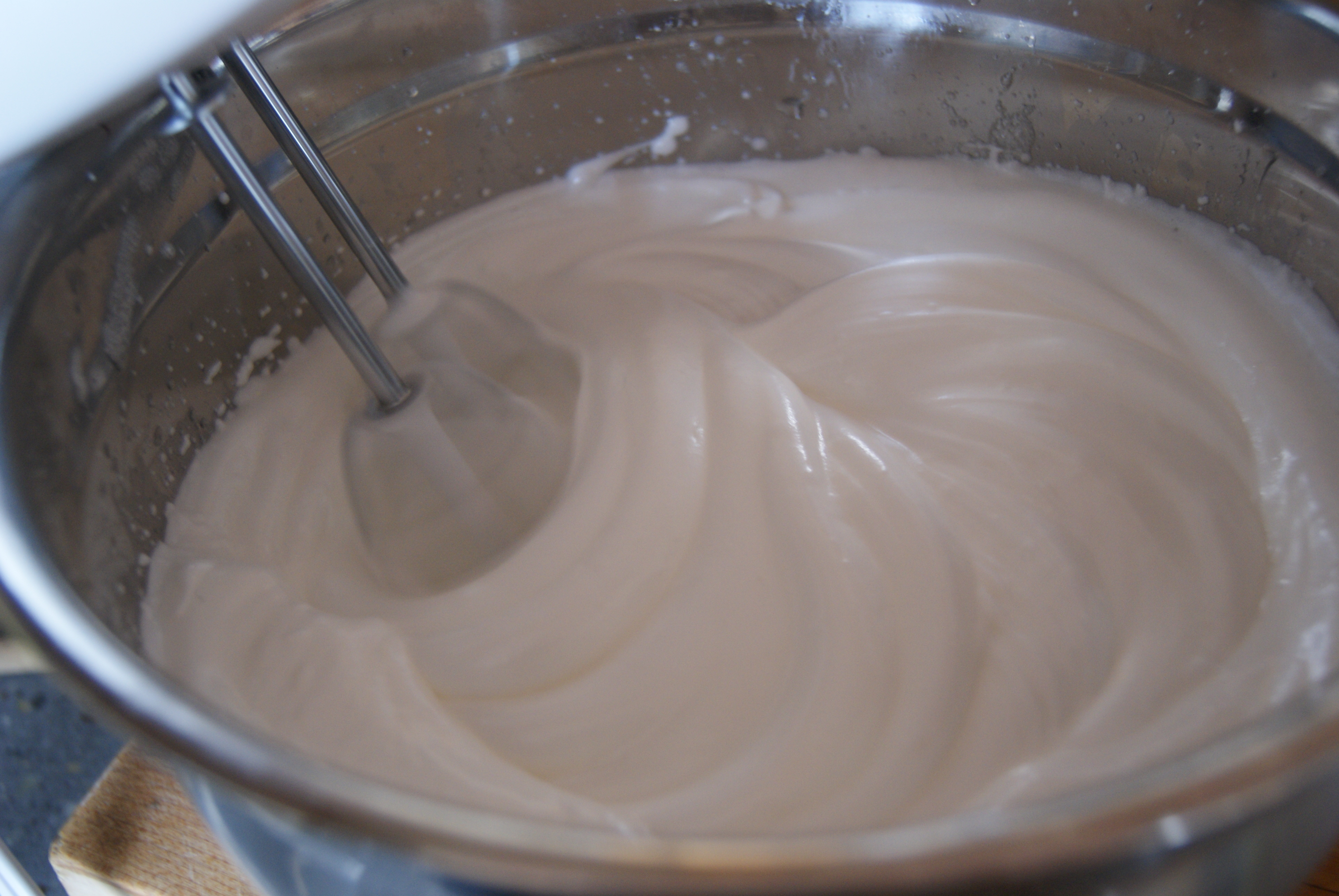 Beat until the mixture is thick and fluffy. This will take about 7 minutes so…have a spotter? Remove from heat, and continue to mix until the frosting has cooled slightly.