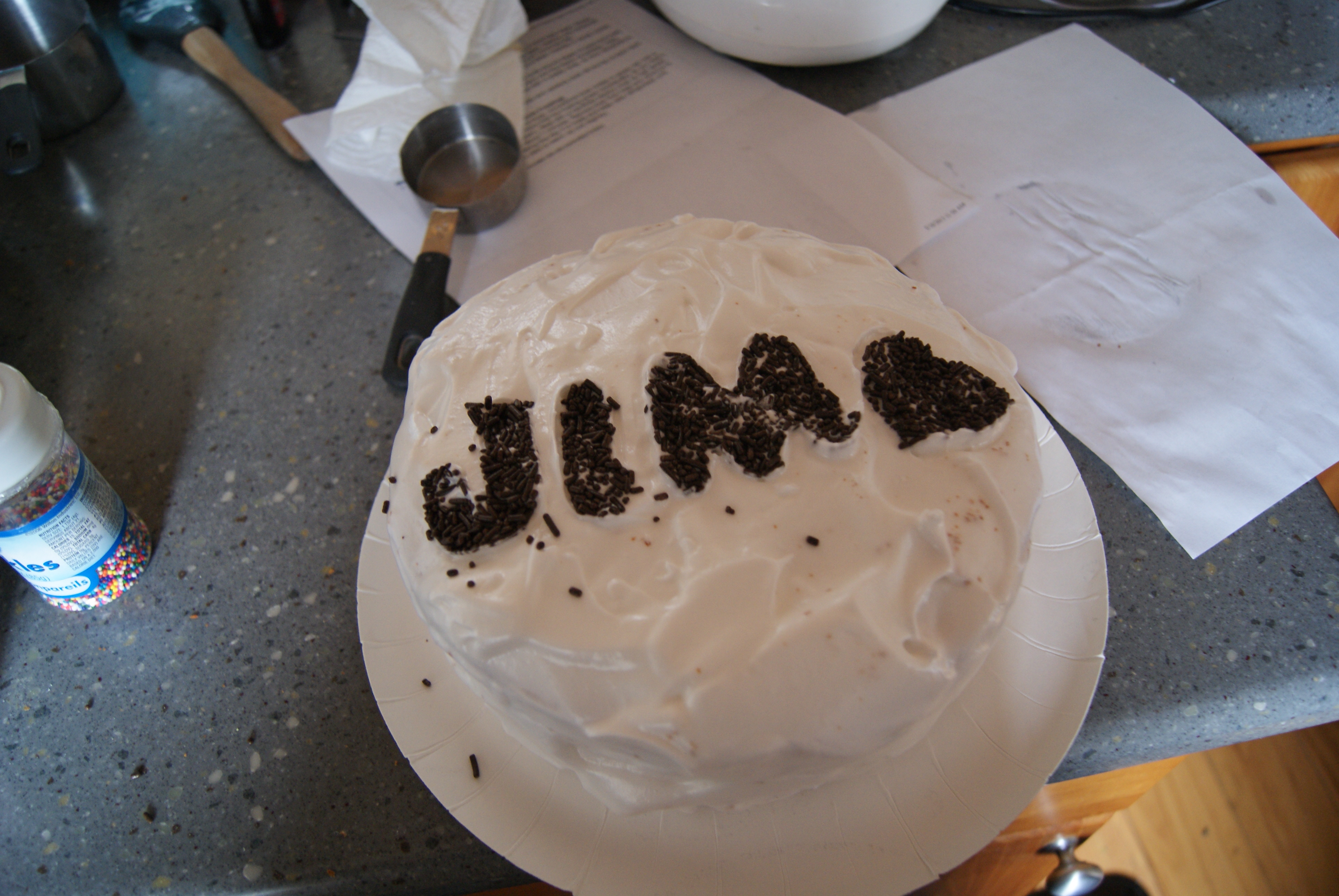 Oh…I hope it’s obvious that my boyfriend’s name is Jim. I feel like I’ve never mentioned that before, but I guess it would be awkward and rude if another man’s name topped my boyfriend’s cake. But it’s Jim, and that’s a heart. And that’s because I love Jim.