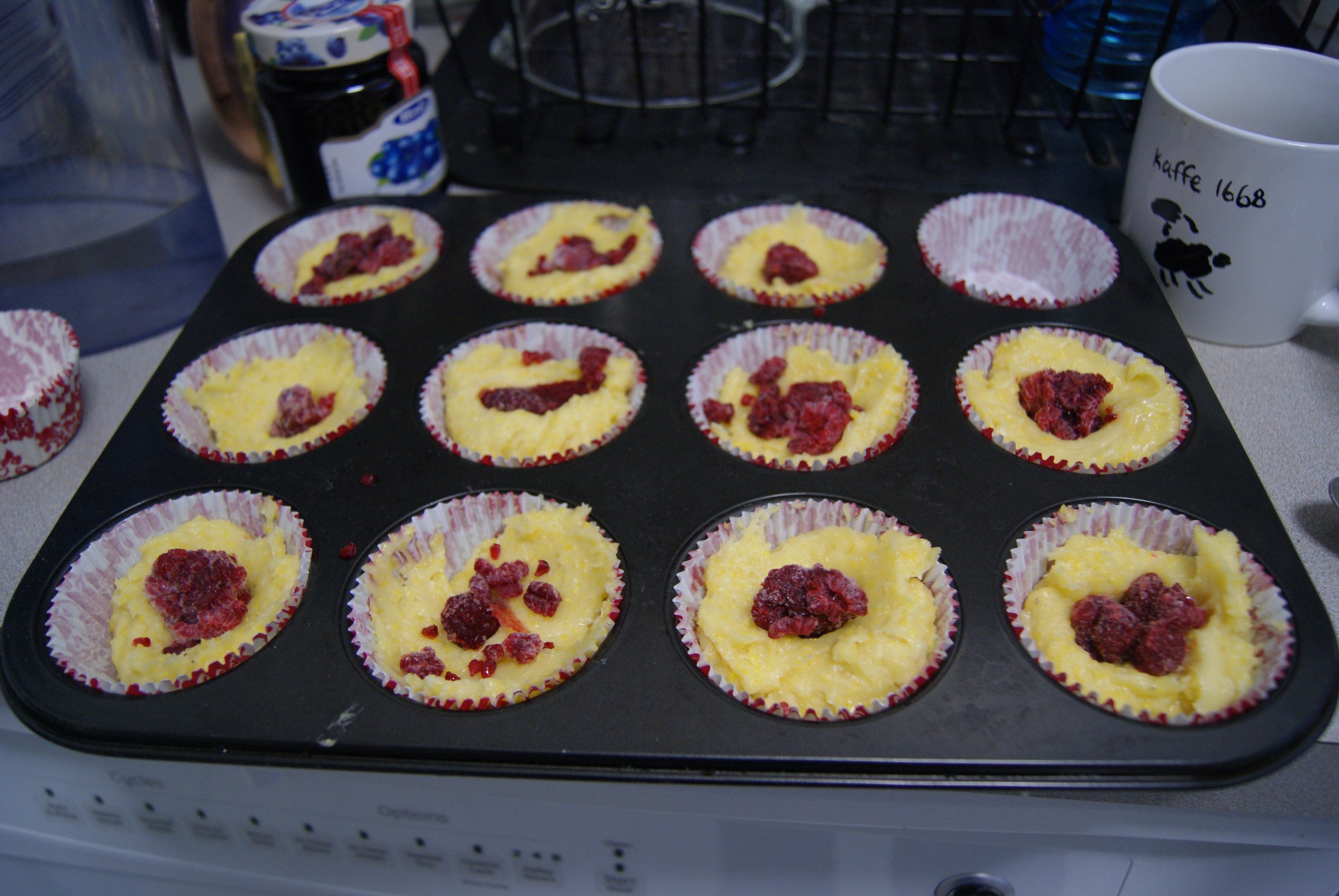 Pour batter evenly into muffin cups (I find that an ice cream scoop helps in this situation). Nestle a raspberry into the middle of each cup until it’s comfy. Yes, seriously.