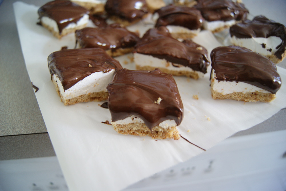 Transfer mixture to a stand mixer and whisk on high speed, taking care that mixture doesn’t splatter. Mix until thickened as much as possible, about 7 minutes. Next, you can either fill a pastry bag with marshmallow mixture or use a rubber spatula to spread mixture directly onto graham crackers. Gently smooth the top of mixture with wet fingers. Let firm and cool completely. At this point, if you haven’t already, you may cut into squares/something that vaguely resembles squares/amoebas/anything you want.