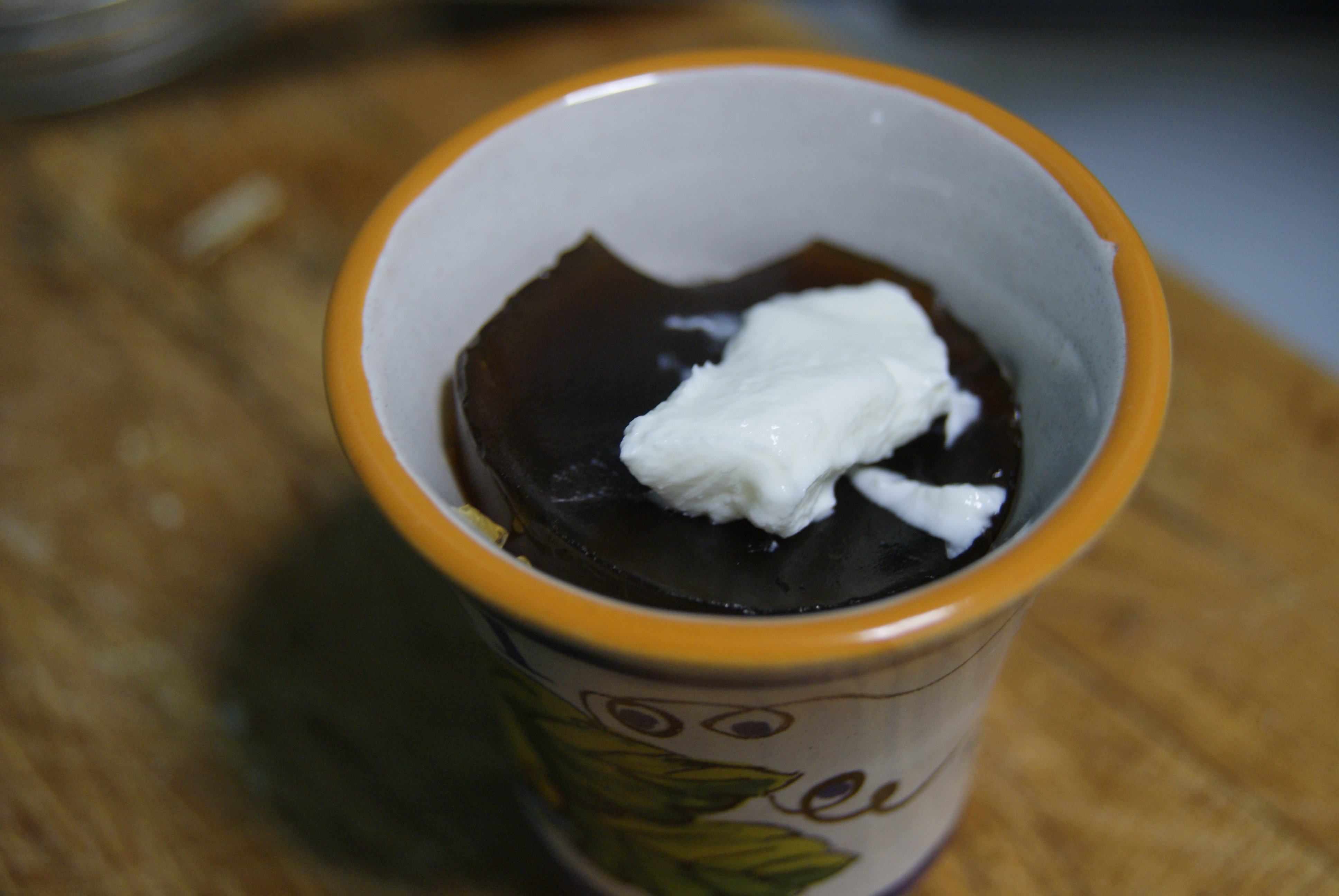 Place brewed coffee in a medium-sized saucepan over medium-high heat, and stir in sugar and gelatin. Bring to a boil, stirring until the gelatin and sugar have dissolved, and remove from heat. Pour mixture into either an 8″ square baking pan or into lightly greased mini-muffin tins. Let chill in refrigerator for at least 4 to 5 hours. If using a baking pan, cut into cubes or desired shapes. If using a muffin tin, just pop these babies out.