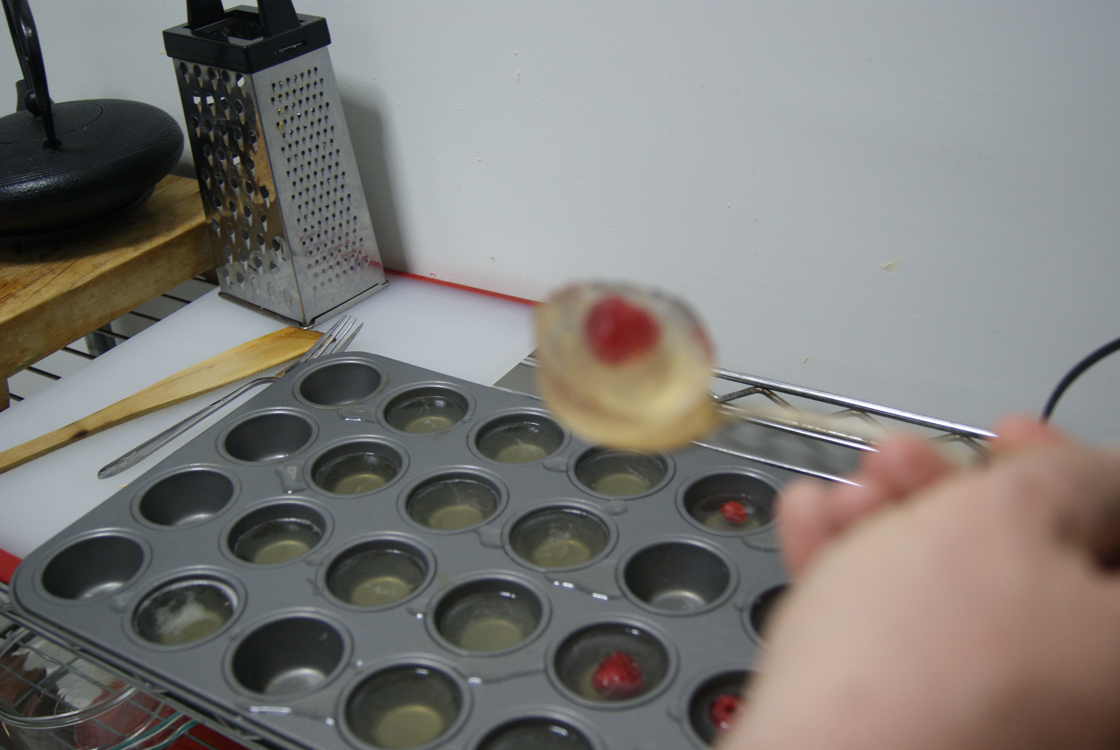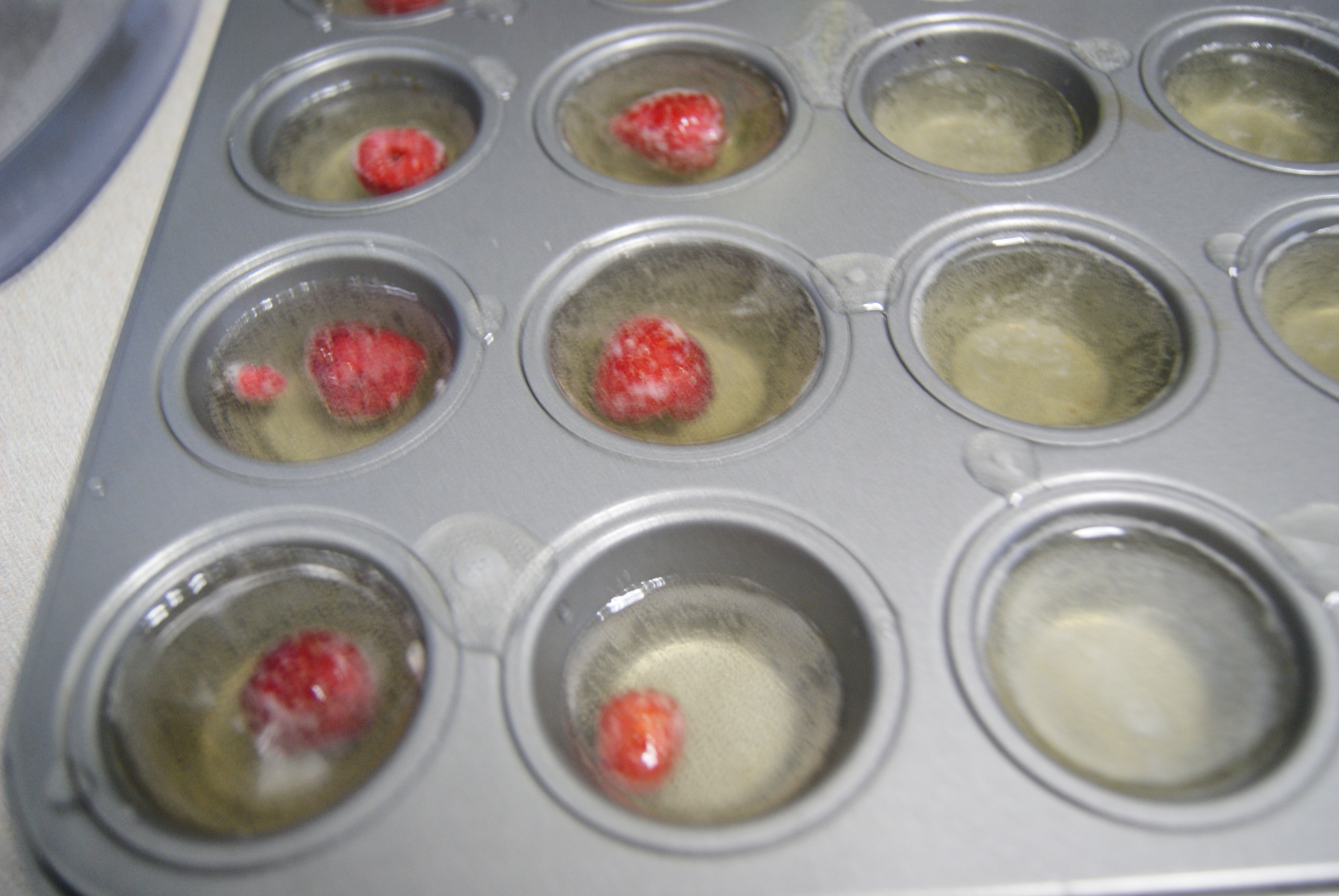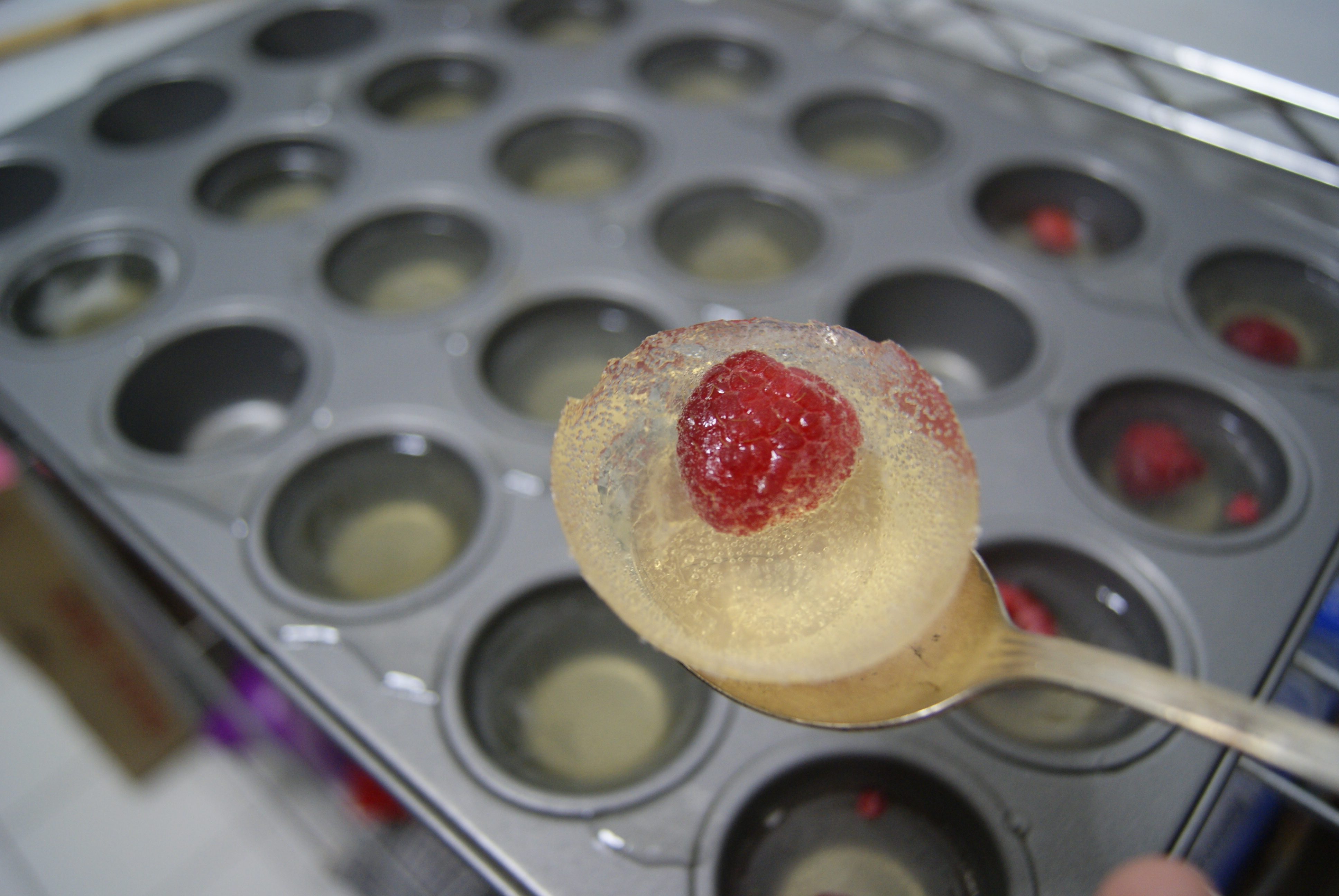 Pour boiling water into a large, heatproof bowl. Sprinkle gelatin over water, and let cool slightly. Pour champagne or whatever bubbly drink you choose over the mixture, then stir gently to incorporate any clumps of gelatin that may have formed. Pour into mold of choice (I used a mini-muffin pan), and place a raspberry or berry of your choosing in the middle of each mixture. Refrigerate for at least an hour, until the jellies have set.