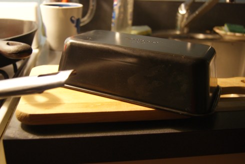 Preheat the oven to 350ºF and do NOT grease your 9×5 loaf pan. No, I’m serious. Leave it ungreased. Like, for reals, put the butter down homie.
