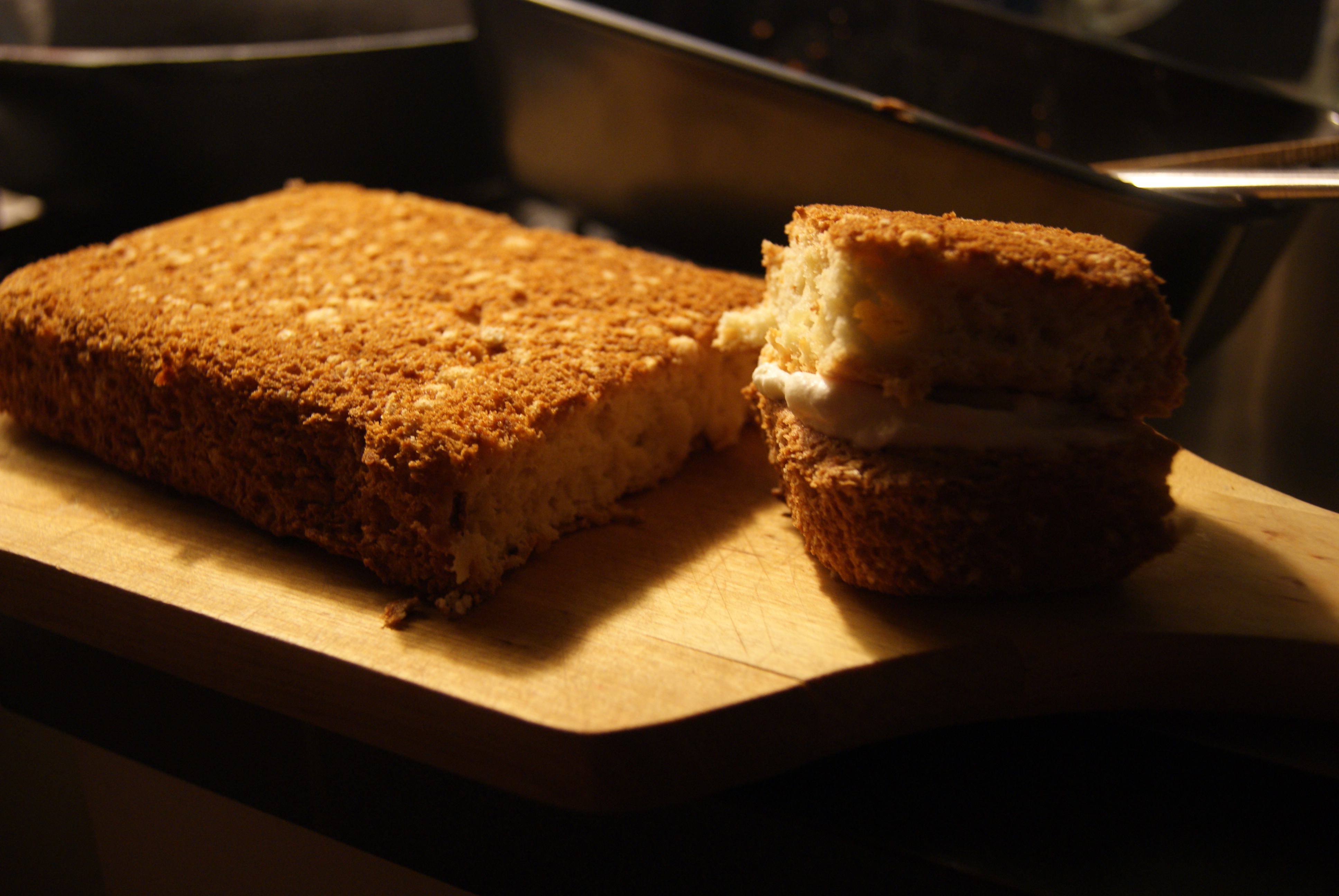 Next, fold the flour/sugar mixture into your egg white mixture and gently mix until all ingredients are fully incorporated. Spread evenly into your loaf pan and send into the oven for 35 to 45 minutes, until the top of your cake is browned and springs back when you touch it.