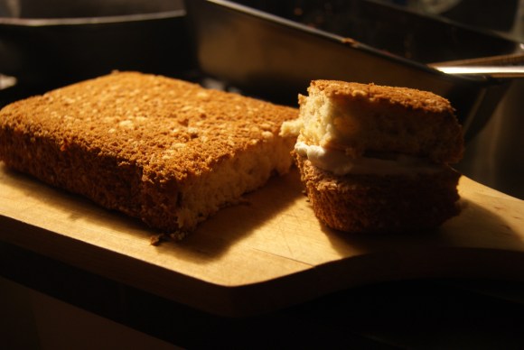 So basically, I took a recipe and, thanks to my high school algebra class and a dearth of egg whites, cut it to a third. The original recipe that can be made in a tube pan (nope, still not entirely sure either) can be found here.