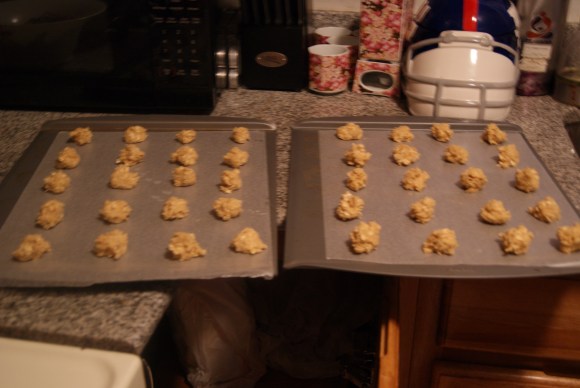 Line baking sheets with parchment paper, then drop small tablespoonfuls onto the sheet, about an inch apart, as these will spread a bit.